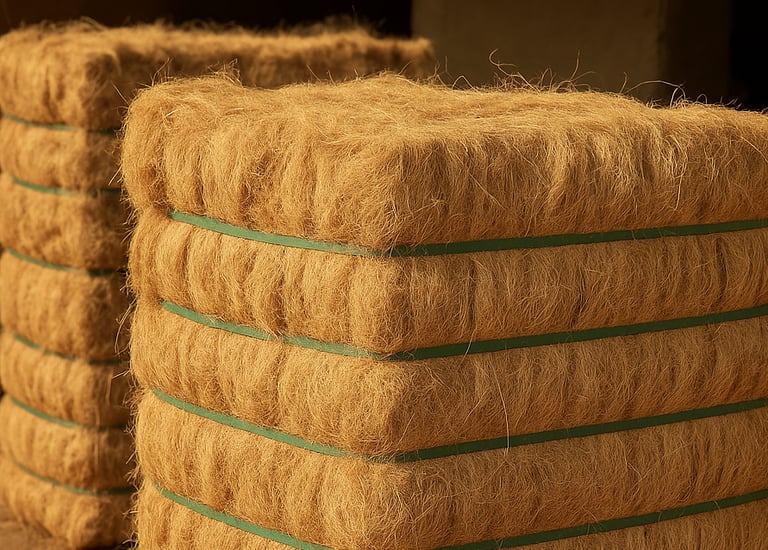 Long fibers from coconut husks. Commonly used in hanging baskets, erosion control mats, good insulation against temperature and for decorative garden purposes.